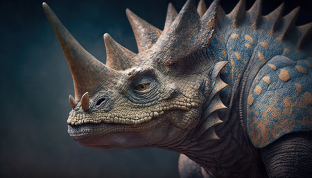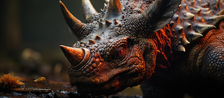 Triceratops dinosaurs on dark background. Dinosaur animal history concept living dinosaur. Late Cretaceous herbivores portrait
