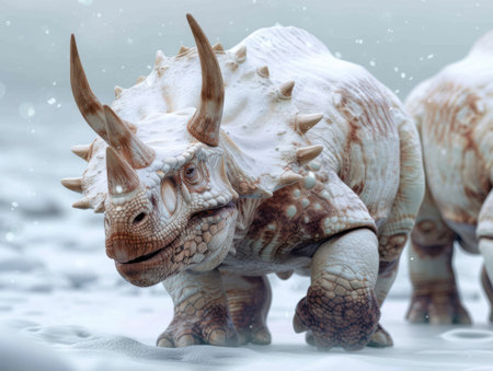Prehistoric armored rhinoceros-like creature in snowy landscape