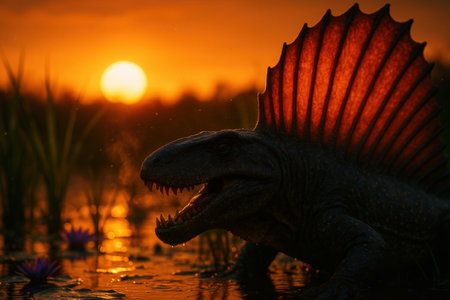 Prehistoric Dimetrodon Predator At Fiery Swamp Sunset