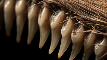 close-up images of a dog's teeth, captured in the style of national geographic photography. the intricate patterns resemble tangled nests, while the accuracy of the bird specimens is evident. shot with a zeiss batis 18mm f2.8 lens, the smooth brushwork highlights the dark brown and beige tones. a captivating portrayal of nature's beauty in the mote kei style. ai generated