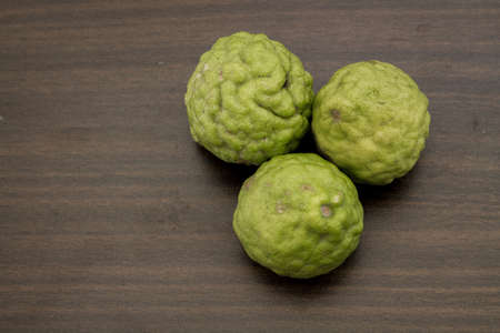 Freshness Of Three Kaffir Lime On Wooden Background.