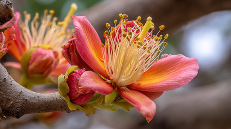 Blooming Gustavia Gracillima: A tropical flower showcasing vibrant pink and orange colors
