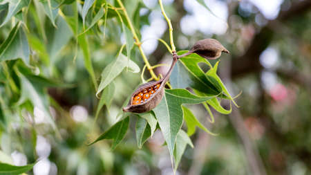 Close-up of Brachychiton populneus seed pods on the tree, Israel