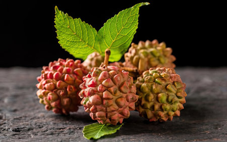 The Star anise in light fog, dew on leaves, light soft diffused, three-quarter view