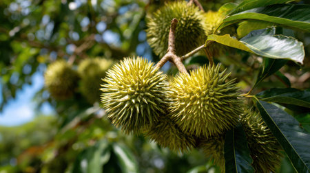 Close-up view of fresh green durian fruits on a tree branch, surrounded by vibrant leaves in a sunny tropical setting, highlighting its unique spiky appearance and natural beauty.