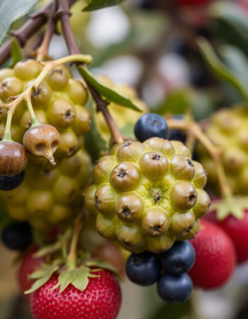 A vibrant cluster of exotic fruits grows on a tropical tree, showcasing a mix of orange and yellow colors. This captivating scene highlights the beauty of nature.