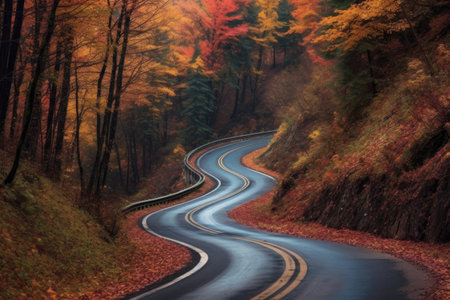 scenic winding road through a fall forest, created with generative ai