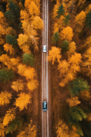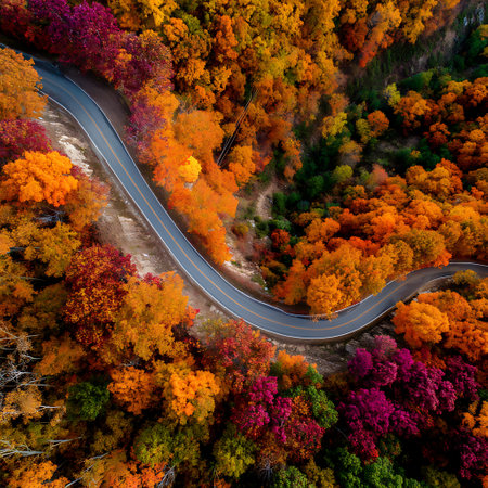 An overhead view of a vivid autumn forest showcases a winding road surrounded by a stunning tapestry of colorful foliage. A perfect blend of nature