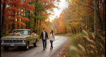Young couple in love walking in autumn forest with retro car and pumpkins