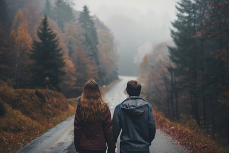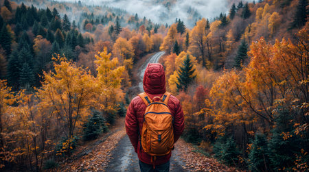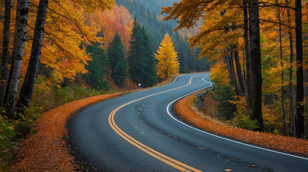 A picturesque winding road through an autumn forest, featuring vibrant fall foliage and a misty atmosphere. Ideal for nature and travel themes.