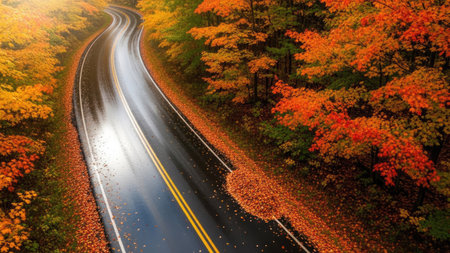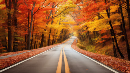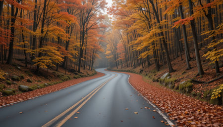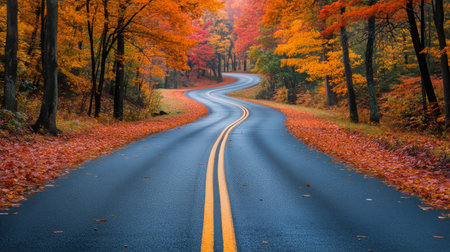 A dark asphalt road curves through a vibrant autumn forest. The trees lining the road are ablaze with the rich colors of fall foliage, displaying shades of red, orange, and yellow. Fallen leaves are scattered across the road and its shoulders, adding texture and a sense of the season. Double yellow lines mark the center of the road, guiding the eye into the distance where rolling hills or mountains are visible. The sunlight filters through the colorful canopy, creating a warm and inviting...