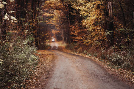 Autumn road in the forest. Beautiful autumn landscape. Fall season.