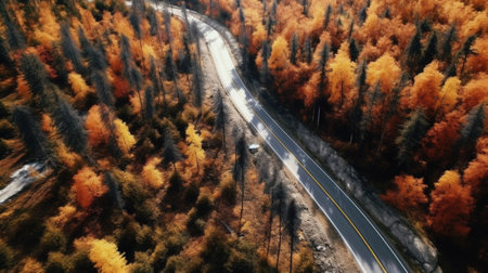 Generative AI : Colourful autumn forest form above with an empty road captured with a drone Natural seasonal landscape background