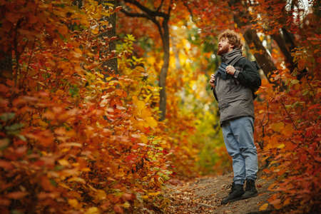 Full-length portrait of young man spending time on open air in the forest on warm autumn day. Hiking