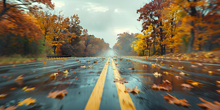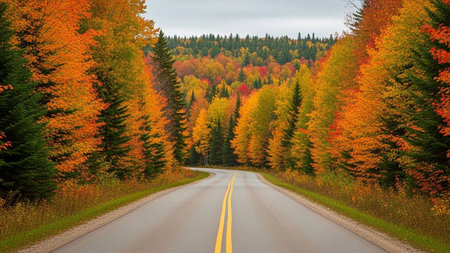 Cruising down highway surrounded by vibrant autumn leaves on overcast day. Concept Road Trip, Autumn Colors, Overcast Weather, Scenic Drive