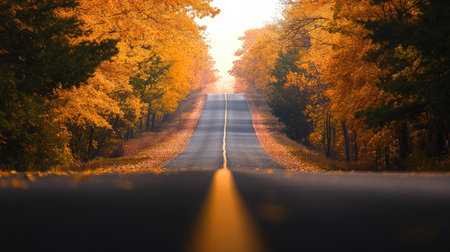 A scenic view of a tranquil autumn road, lined with vibrant golden leaves and trees, inviting a peaceful journey through nature