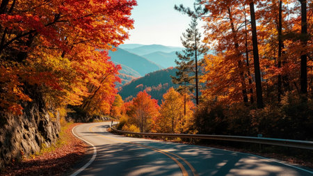 Experience the breathtaking beauty of autumn with this stunning image. A winding road carves through a landscape ablaze with the vibrant colors of fall foliage. Towering trees display brilliant orange, yellow, and red leaves, contrasting against the majestic mountains in the distance. This scenic vista offers a sense of adventure and tranquility, perfect for illustrating travel, nature, and outdoor themes. Ideal for websites, brochures, and marketing materials, capturing the essence of a beautiful autumn day and the picturesque path towards the horizon.