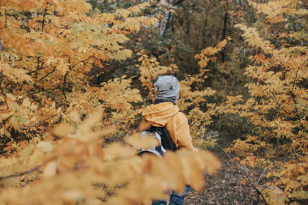 The boy walks through the autumn forest.