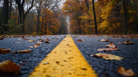 A quiet road with a yellow line and fallen leaves scattered on the ground, evoking a peaceful autumn atmosphere