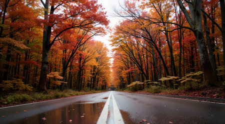 A tranquil scene of an autumn road coated in rain, surrounded by vibrant foliage. The misty atmosphere creates a serene, refreshing environment for nature lovers.