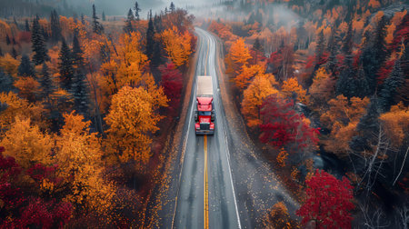 The aerial view of a heavy truck on a narrow road with twists and turns in autumn. Fields of colorful fall trees line the narrow road.