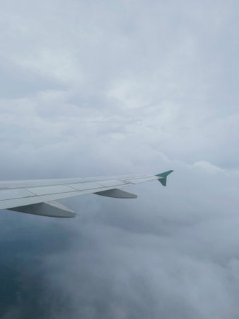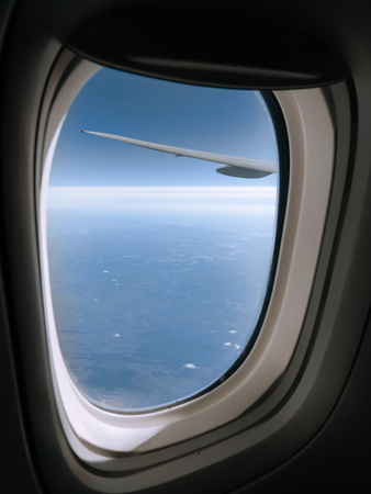 Tourism Aspiration Concept - Sky view of wing from Airplane Window - Stock Image as JPG File