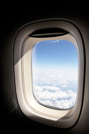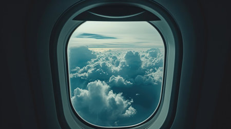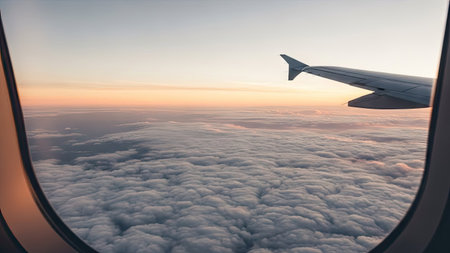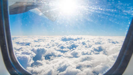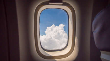 Scenery view of cloudscape outside the airplane window. Conceptual of traveling by plane.