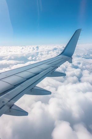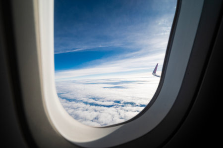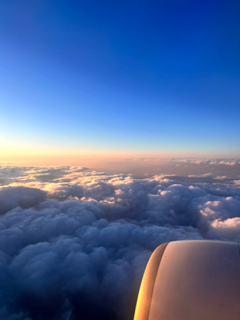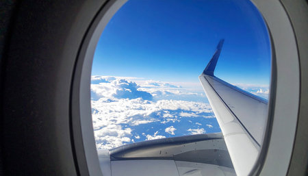View from an airplane of clouds, beautiful blue sky from the window while traveling