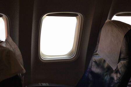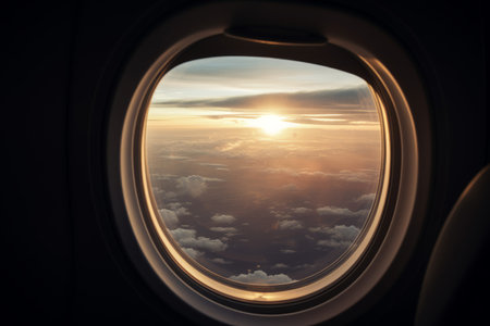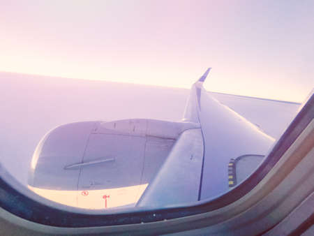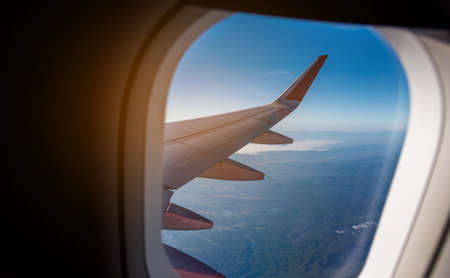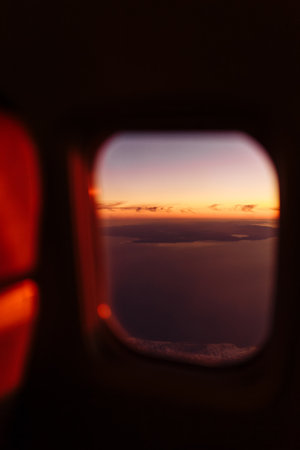 Beautiful scenic view through the aircraft window at sunset or sunrise time. vacation and travel.