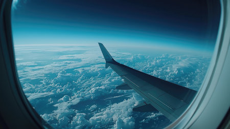 Plane wing visible through window with clouds and Earth's curve seen from high above in space-like perspective
