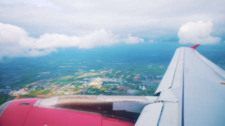 View from the plane on the wings of the plane, the pink engine, the clouds, and the inhabited ground. High-quality photo