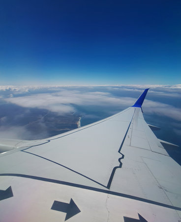 Adventure, travel, transport concept. View from plane window at sky with clouds and wing