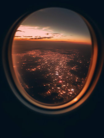 Looking out of the window of the plane, sitting in the cabin, night sky with Generative AI