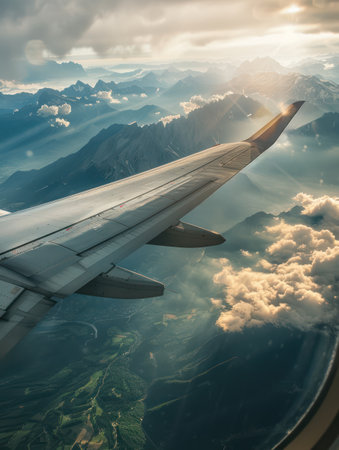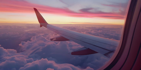 Flying and traveling, view from airplane window on the wing on cloudy sunset afternoon