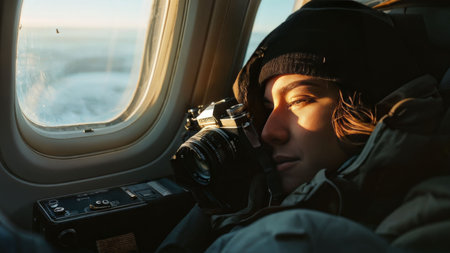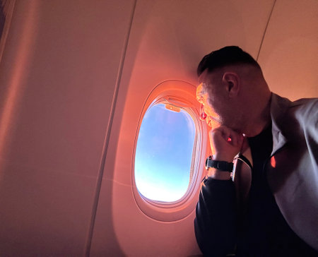 Young man looks out window of an airplane during beautiful sunrise. Order sunrise and flight to a new life in business class