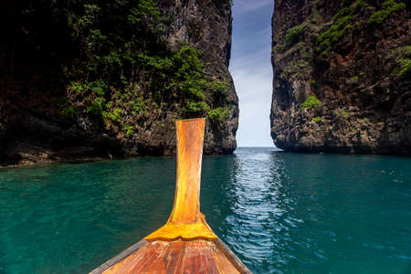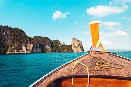 Traveling in Thailand. Amazing view from over Thai traditional wooden longtail boat travel on the sea tropical island with scenery of beautiful sea and sky.