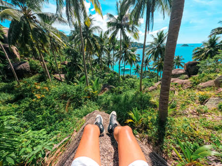Young woman travels to take pictures of nature on the mountain. Travel adventure. Landscape Beautiful Mountain on sea at Samet Nangshe Viewpoint. Phang Nga Bay, Travel Thailand, summer holiday.