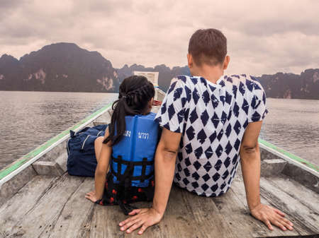 Wooden boat on sailing travel in Ratchaprapa Dam and Cheow Larn Lake, Khao Sok nature beautiful in Thailand