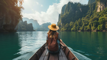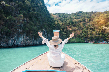Happy Woman tourist in private longtail boat trip to koh Hong lagoon island at Krabi, Thailand. landmark, tropical destination, southeast Asia Travel, summer vacation, wanderlust and holiday concept