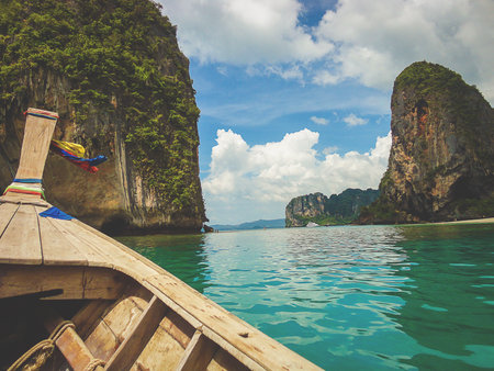 Tip of a tourist wooden boat cruising along the impressive karst formations on the coast of Thailand near Krabi