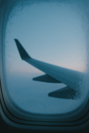 Winter flight. Frosted window. Calm sky.