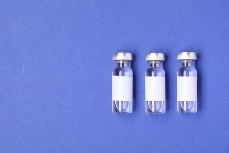 Transparent ampoules, bottles with medicine or vaccine on a blue background. Place for text. Copy space.
