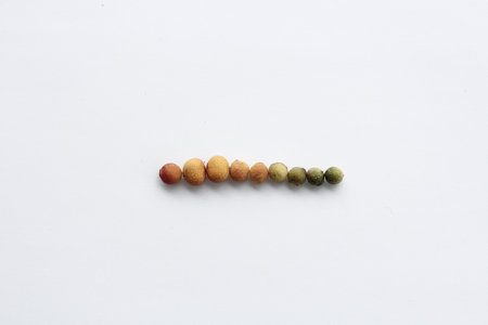 A collection of dried, open seed pods with visible seeds, scattered on a neutral surface.