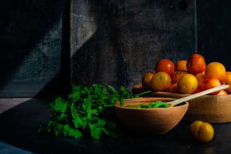 Herbs fruit in wicker basket, Sun shines from the window, Top view.