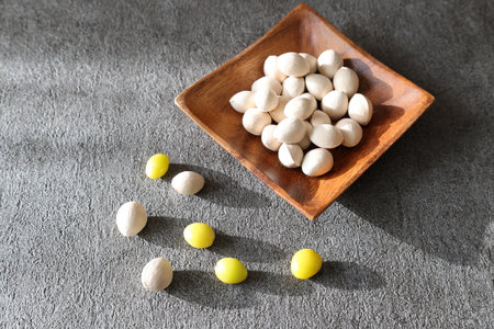 Ginkgo nuts in a wooden bowl isolated on a gray background.