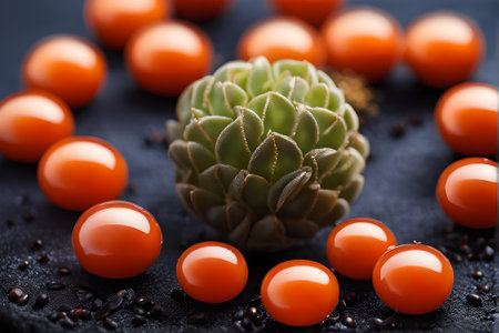 Cactus and cherry tomatoes on a black stone background. Selective focus.