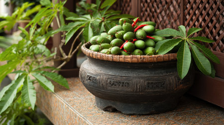 A beautifully arranged bowl containing fresh green fruits and vibrant red chilies sits on a rustic stone surface, surrounded by lush green leaves.