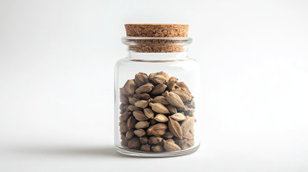A clear glass jar filled with aromatic spices like cardamom and cloves, showcasing natural ingredients perfect for culinary creations and kitchen decor.