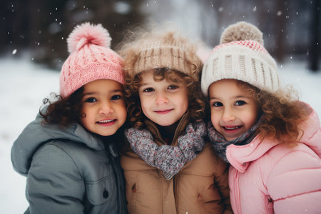 Three little girls hugging each other in the snow