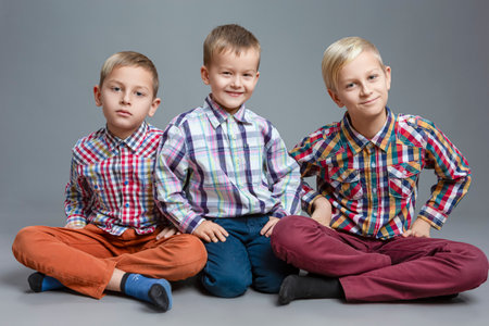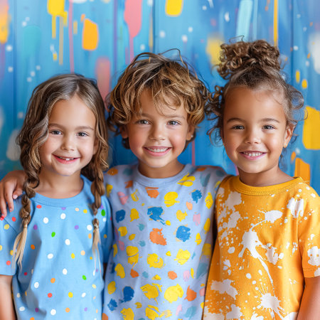 Three young children are posing for a picture, colorful wearing shirts with polka dots and other patterns. They are smiling and seem to be enjoying themselves. Concept of happiness and fun